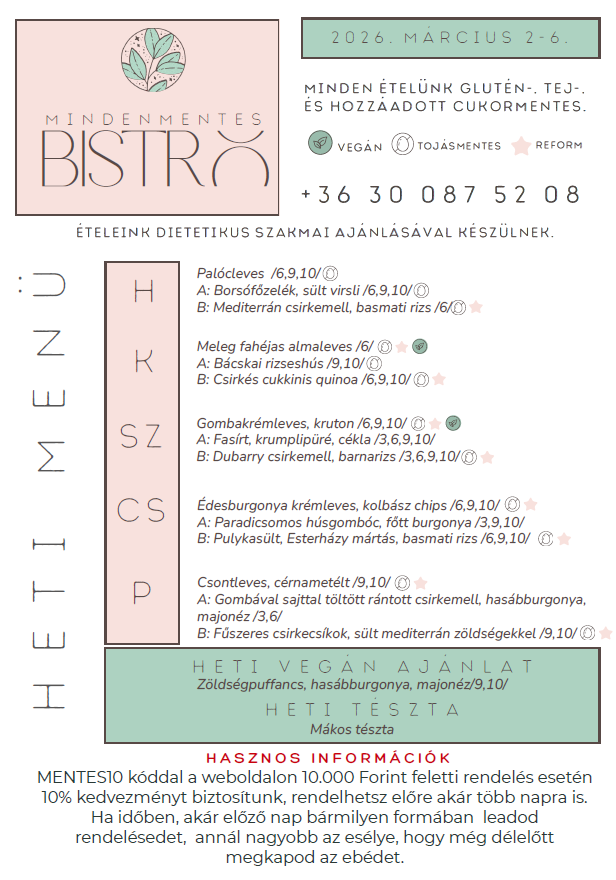 Fedezd fel heti menünket, amely glutén-, tej- és hozzáadott cukormentes finomságokat kínál! Ajánlatunkban megtalálhatók a hagyományos ízek, valamint a diétások számára is megfelelő reformételek (*jelölés). Minden héten külön gondolunk a vegán étkezésűekre is, és legalább egyféle, állati eredetű összetevőtől mentes heti menüvel várunk.